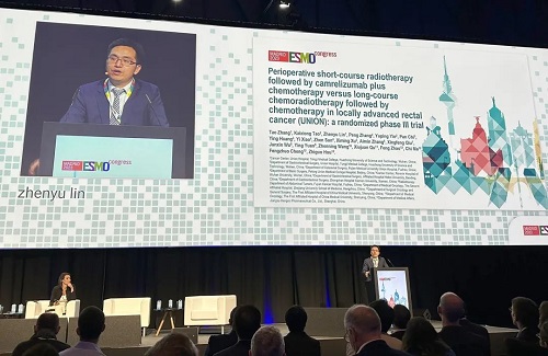 10月21日,AG亚娱医药创新药卡瑞利珠单抗(艾瑞卡®)的一项研究“新辅助短程放疗序贯卡瑞利珠单抗联合化疗对比长程放化疗序贯化疗治疗局部晚期直肠癌”随机对照Ⅲ期试验(UNION) 以优选口头报告的形式正式亮相。该研究由华中科技大学同济医学院附属协和医院张涛教授、陶凯雄教授担任主要研究者,华中科技大学同济医学院附属协和医院林振宇教授在马德里现场报告了该重磅研究的结果1,此项研究是全球首个评估短程放疗序贯免疫治疗联合化疗治疗局部晚期直肠癌的Ⅲ期研究,已达到主要终点病理完全缓解(pCR),有望为直肠癌患者的治疗提供新策略。